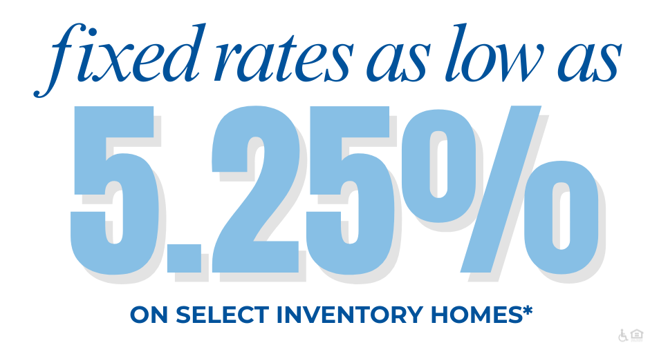 5.25% fixed rate (5.63% APR for Conventional loans) on select inventory homes.30-year fixed, 10% down. VA & FHA rates vary—contact sales for details. On approved credit. Must use preferred lender. Subject to change without notice. Offer ends 3/18. Equal Housing Lender.