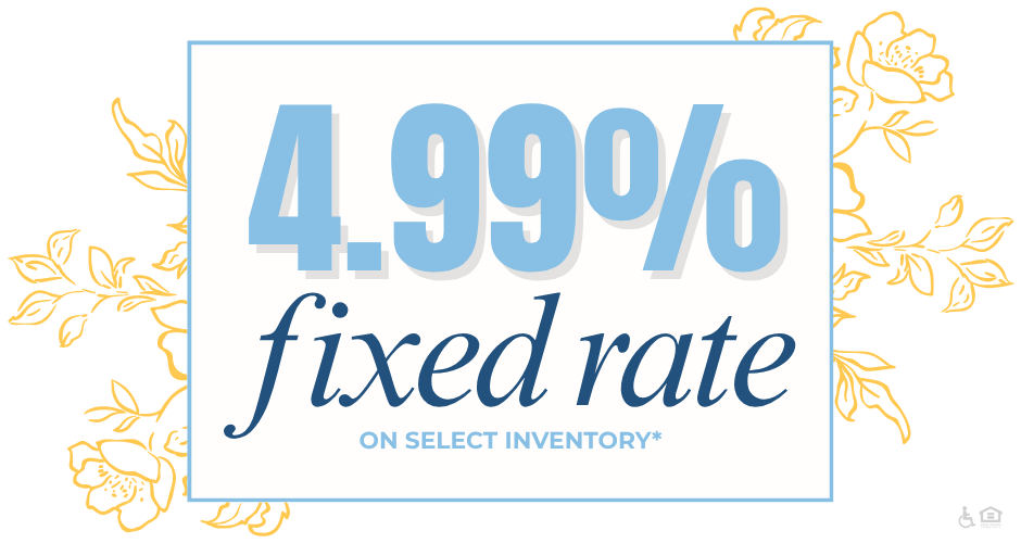Fixed rates as low as 4.99% (5.115%% APR for Conventional loans) on select inventory homes. 30-year fixed with 20% down. VA and FHA rates vary—contact sales for details. On approved credit. Must use preferred lender. Offer ends 4/30/2026. Subject to change without notice. Equal Housing Lender.